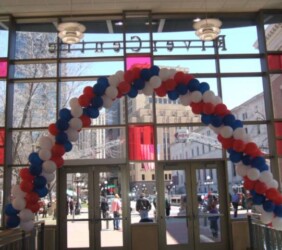 Swirl Arches: swirl arches wrap several strands of balloons around each other, giving a candy-cane or striped effect when contrasting colors are used
